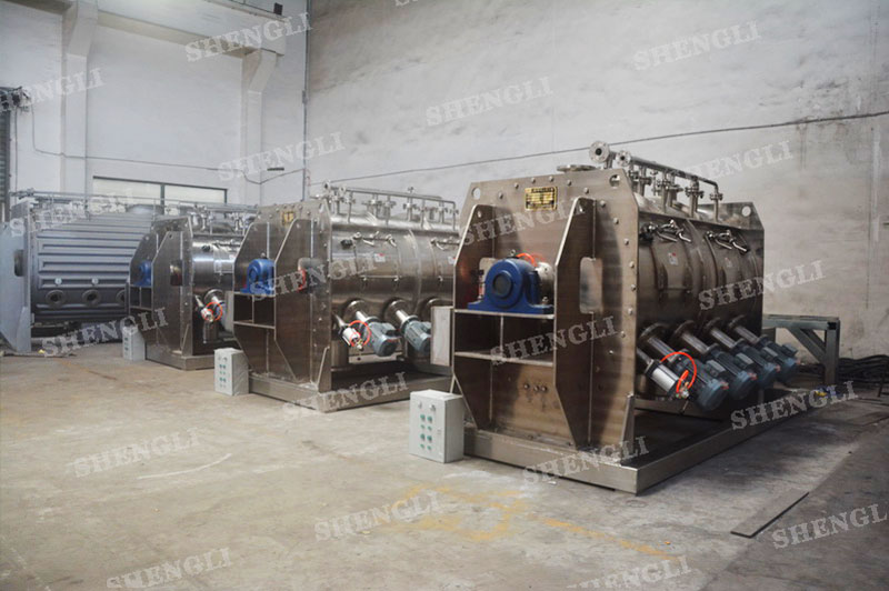 工作原理:臥式犁刀攪拌機采用臥式圓柱筒體,內設平行主軸,主軸上安裝若干犁式刀頭,通過較快的旋轉速度,分割、重合物料,實現快速攪拌的功能,常結合1500-3000轉高速剪切飛刀相互作用。