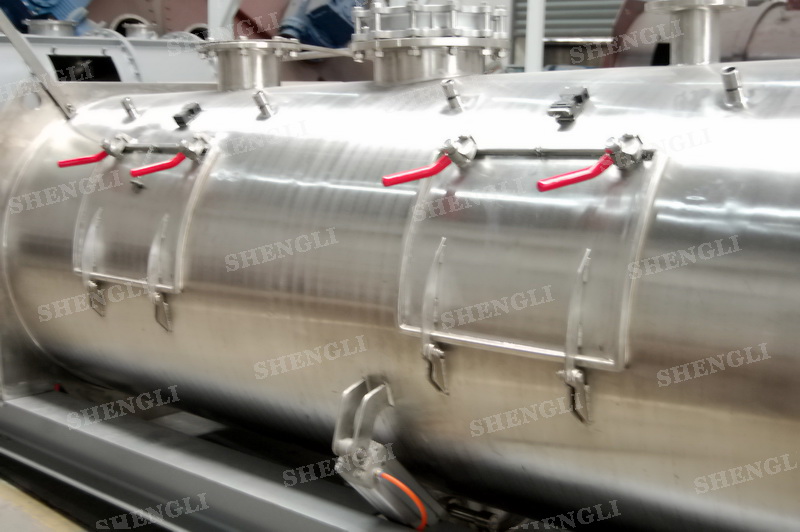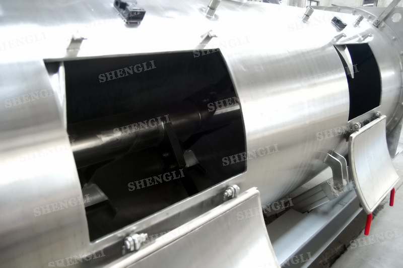 設備配置:配置SEW品牌R系列減速機,平行安裝;筒側開設快開式檢修門附安全開關;出料口采用氣動翻板閥;筒體上設置噴液噴頭;設備主軸采用氣密封;設備內、外表面拉絲亞光。