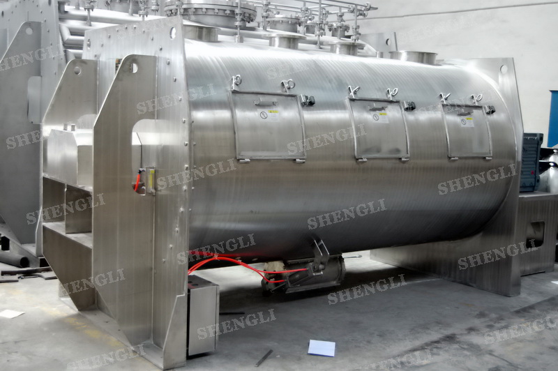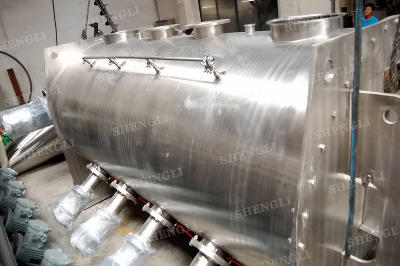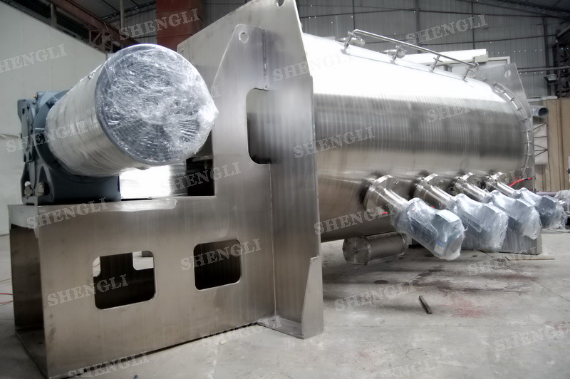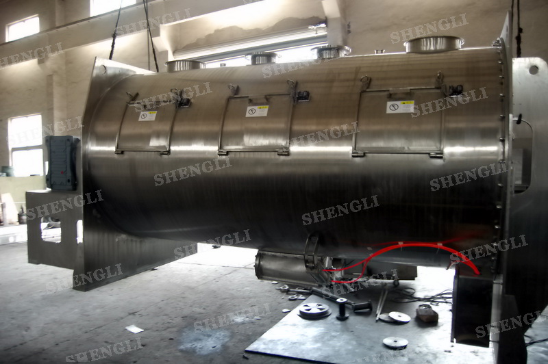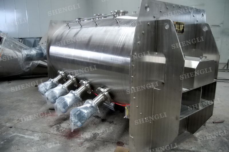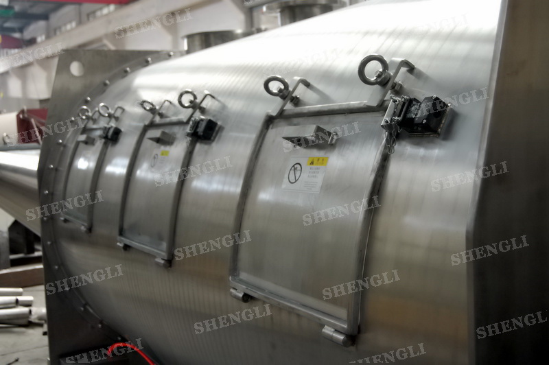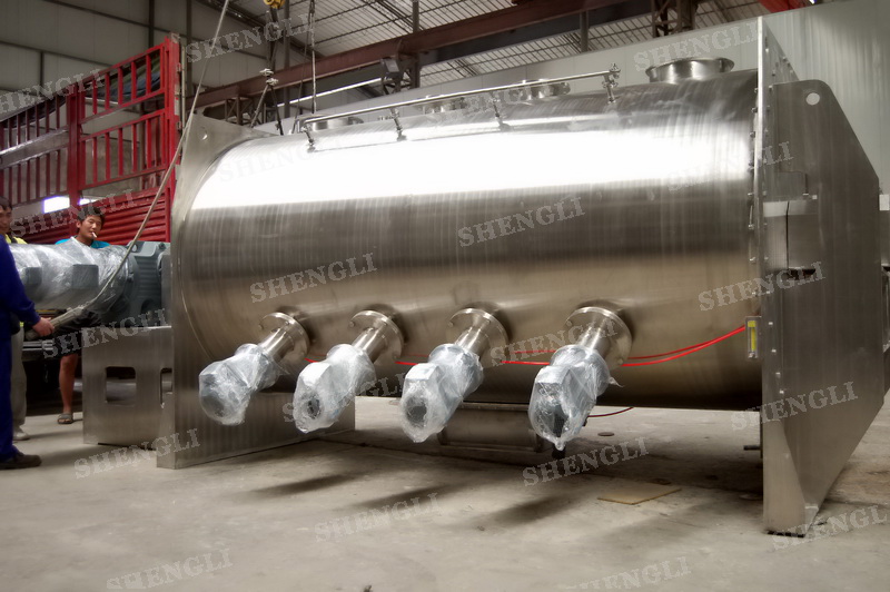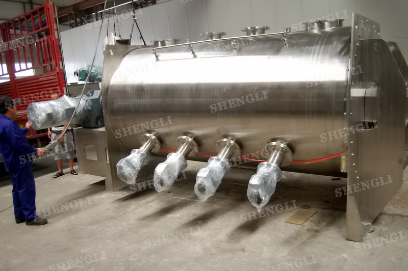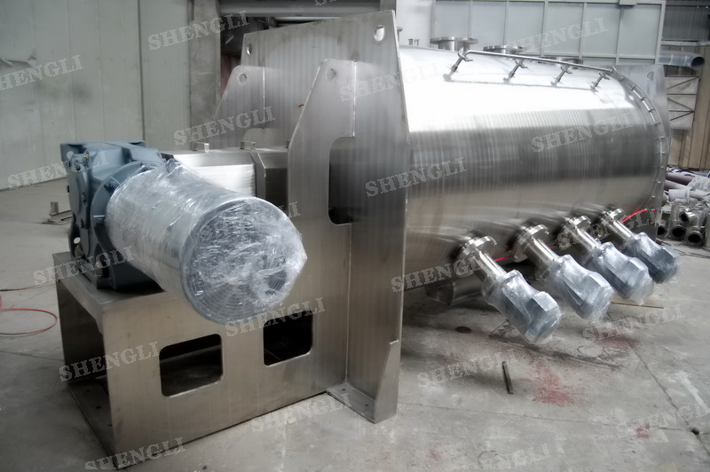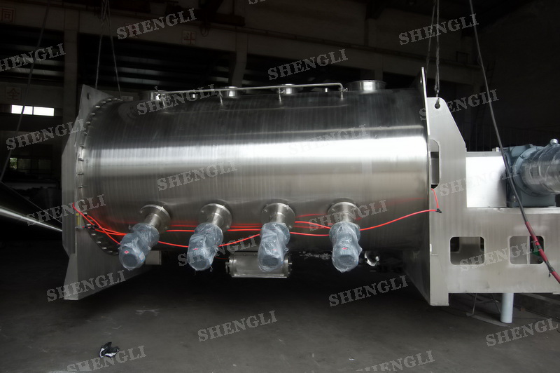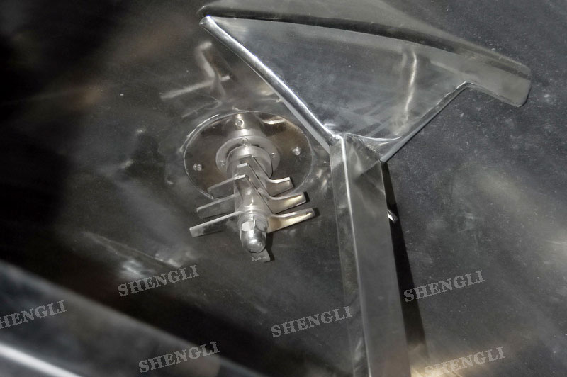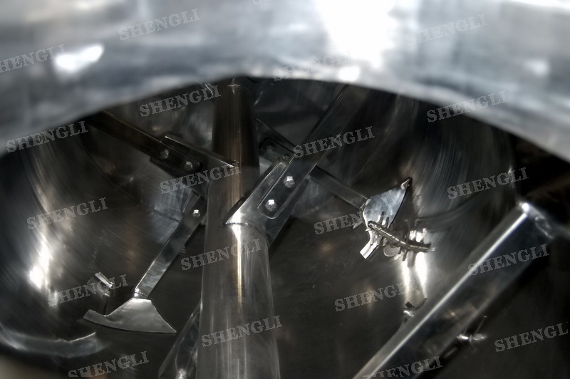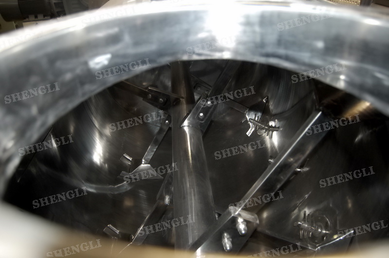 工作原理:犁刀式攪拌機(jī)采用臥式圓柱筒體,內(nèi)設(shè)平行主軸,主軸上安裝若干犁式刀頭,通過較快的旋轉(zhuǎn)速度,分割、重合物料,實(shí)現(xiàn)快速攪拌的功能,常結(jié)合1500-3000轉(zhuǎn)高速剪切飛刀相互作用。