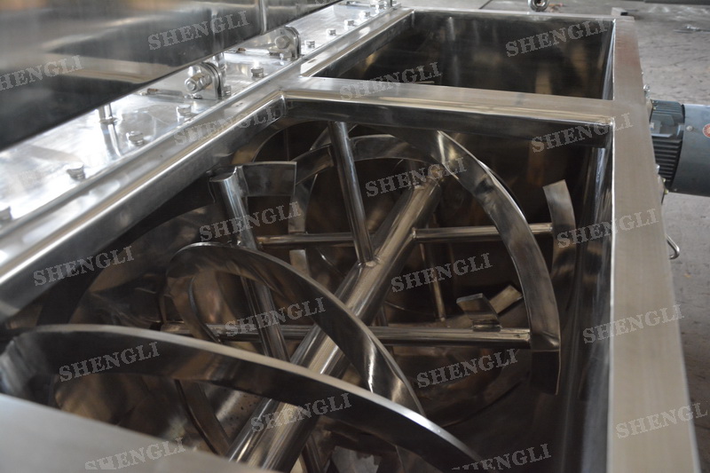 工作原理:螺帶式混合機采用U型筒體,內裝平行主軸,主軸上安裝正反雙向的盤條螺帶,不同維度螺帶分內螺帶與外螺帶,物料在螺帶的驅使下反復參混,能夠快速高效的混合。